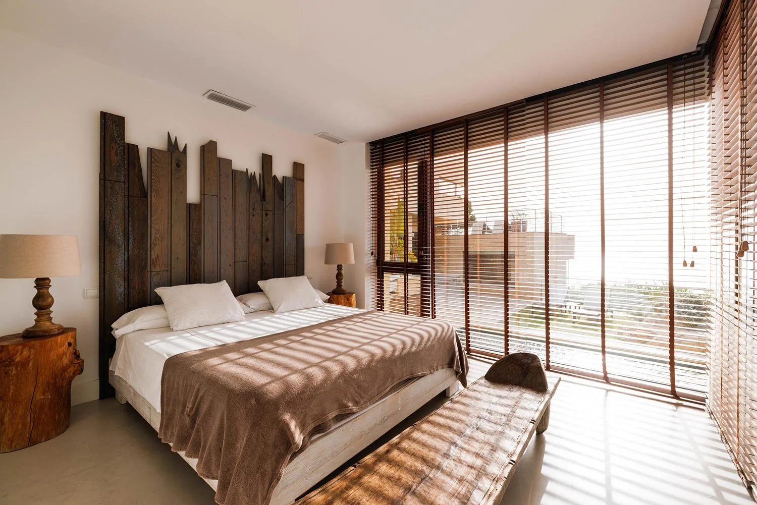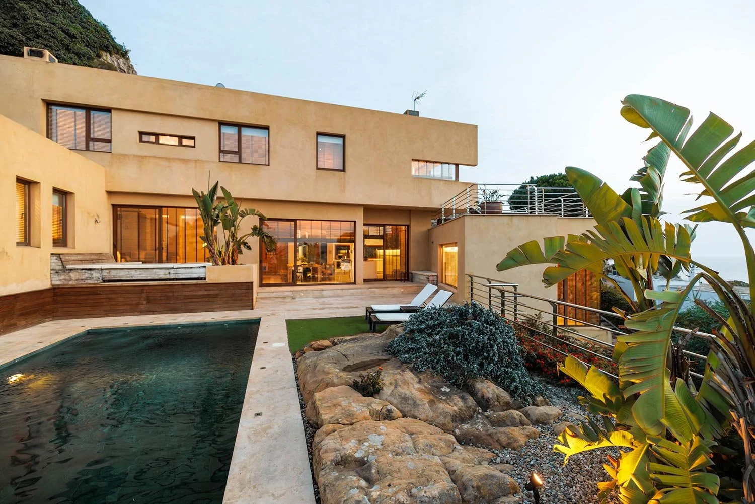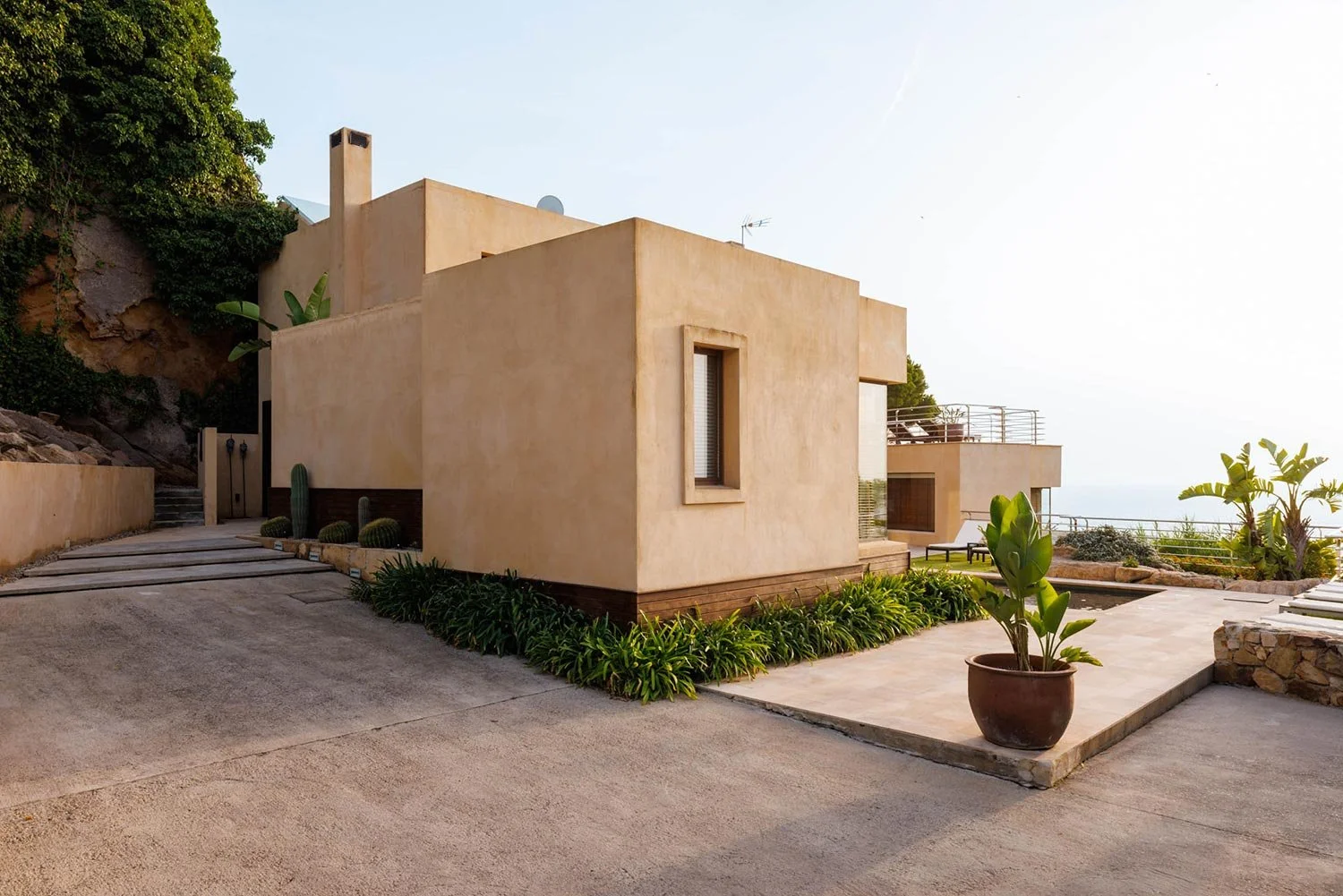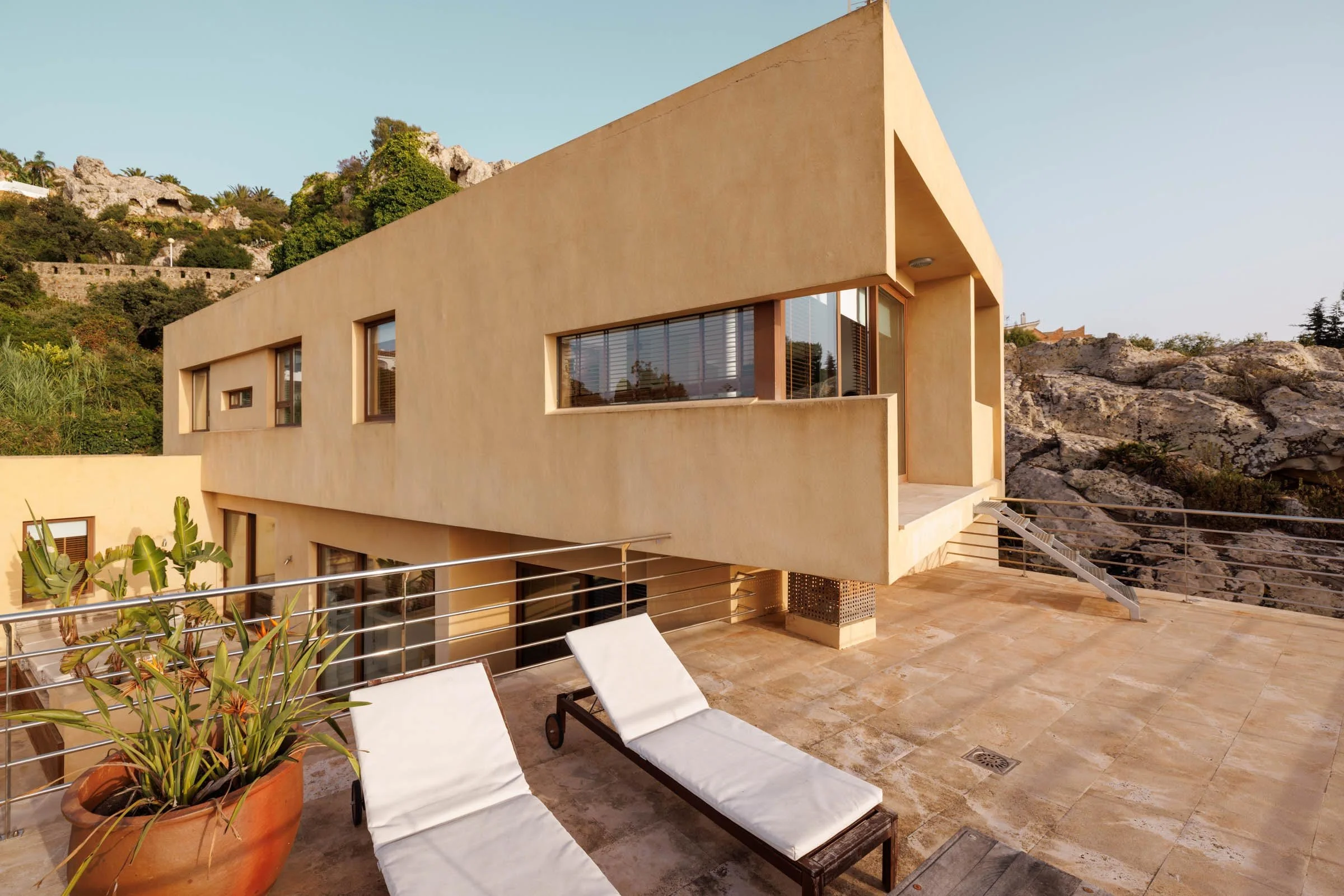 The villa consists of three interconnected houses. The central module on the first floor has a light-flooded living room, a stylish kitchen, a solarium and a private pool. The upper floor has three double bedrooms and two bathrooms, one of which has an en-suite bathroom and solarium. The east and west modules (two modules) each have two double bedrooms with en-suite bathrooms. The house has two gardens and a private cave.