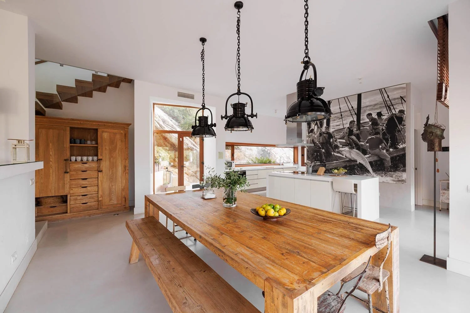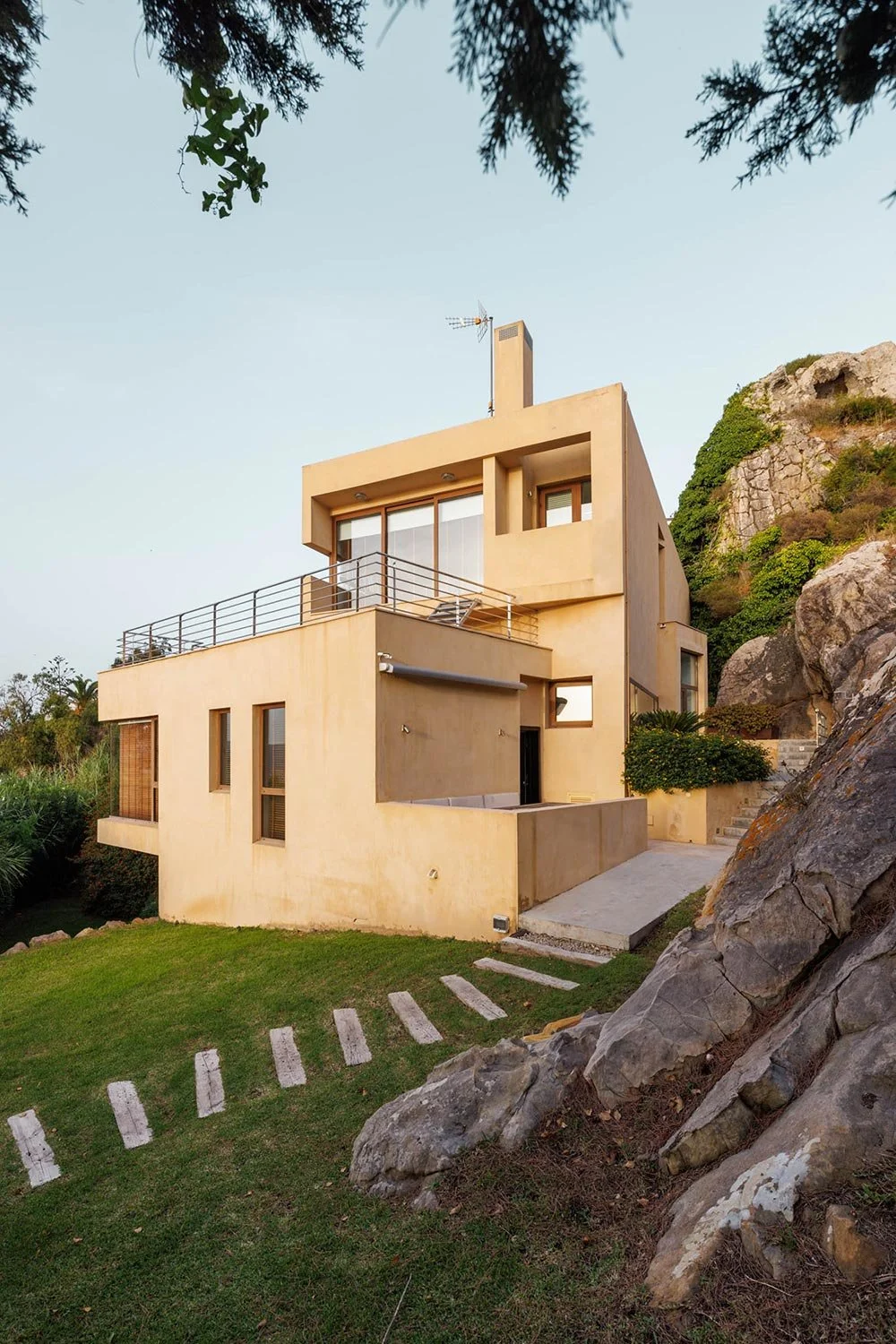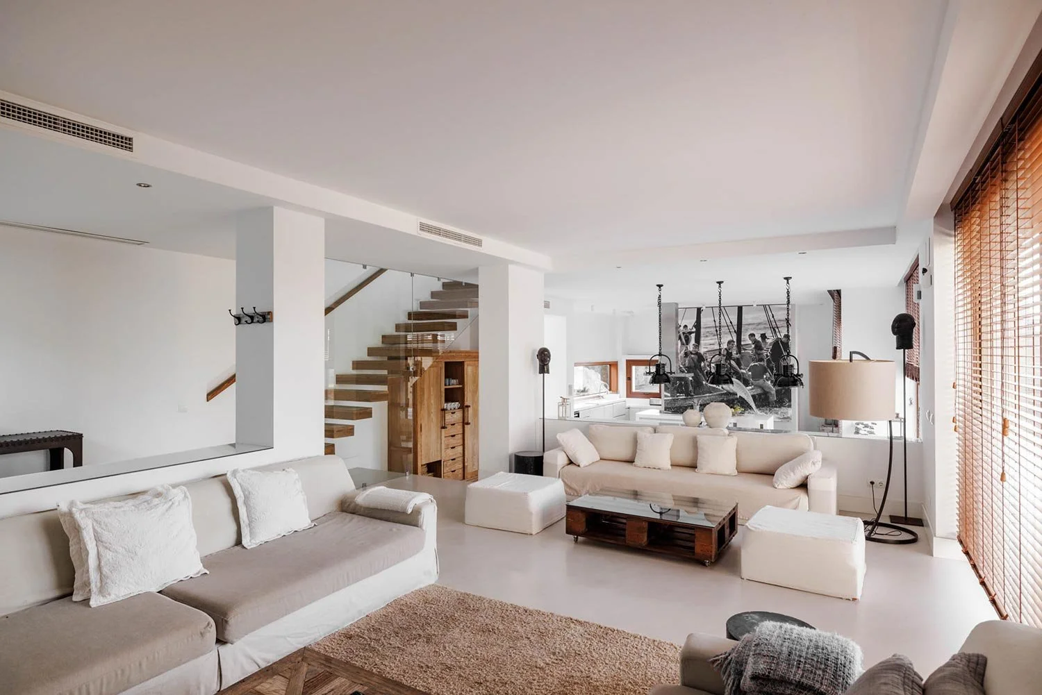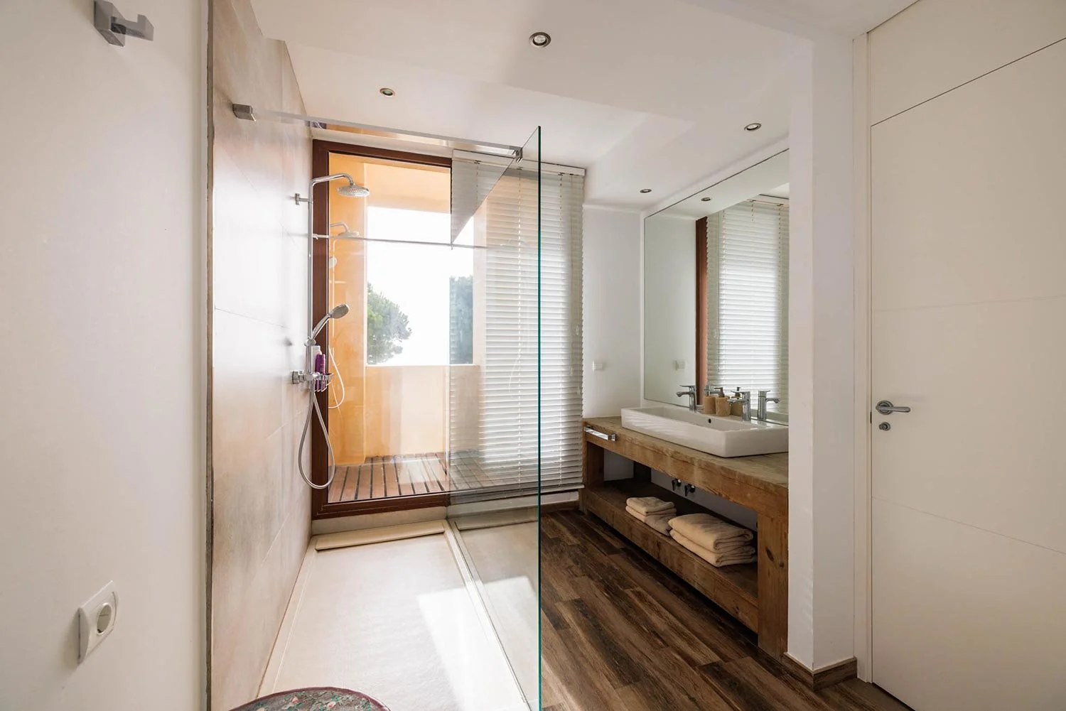 The villa consists of three interconnected houses. The central module on the first floor has a light-flooded living room, a stylish kitchen, a solarium and a private pool. The upper floor has three double bedrooms and two bathrooms, one of which has an en-suite bathroom and solarium. The east and west modules (two modules) each have two double bedrooms with en-suite bathrooms. The house has two gardens and a private cave.
